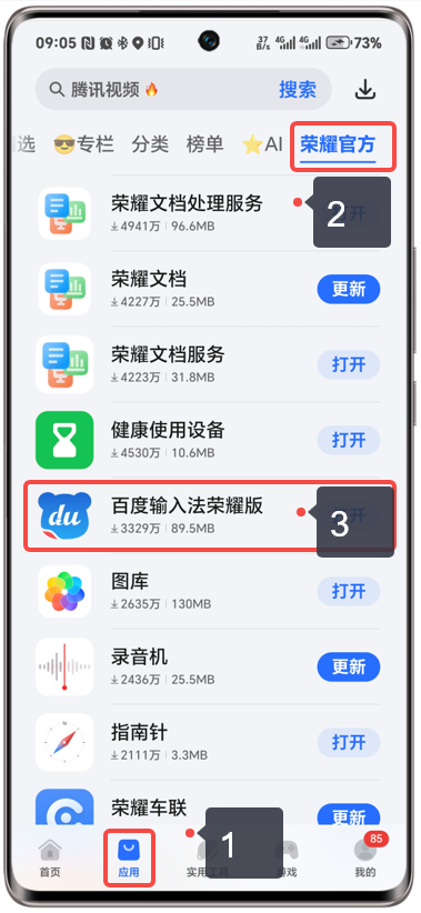 - 进入荣耀应用市场>点击“ 应用”>在上方菜单栏点击“荣耀官方”,找到“百度输入法荣耀版”, 更新至最新版本(MagicOS 8.X 及以下版本用户升级到8.2.508.436版本,MagicOS 9.X 及以上用户升级到8.2.509.317版本)。若未搜到如上版本,请连接WiFi后在应用市场尝试刷新。