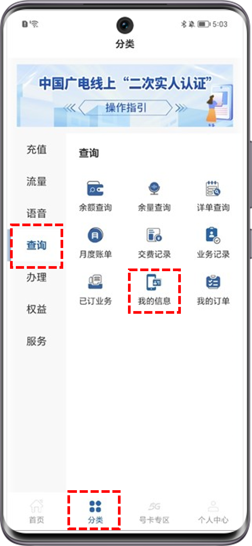 手机App:打开广电的营业厅App(中国广电App),点击分类>查询>我的信息,查看当前登录手机号和入网时间。